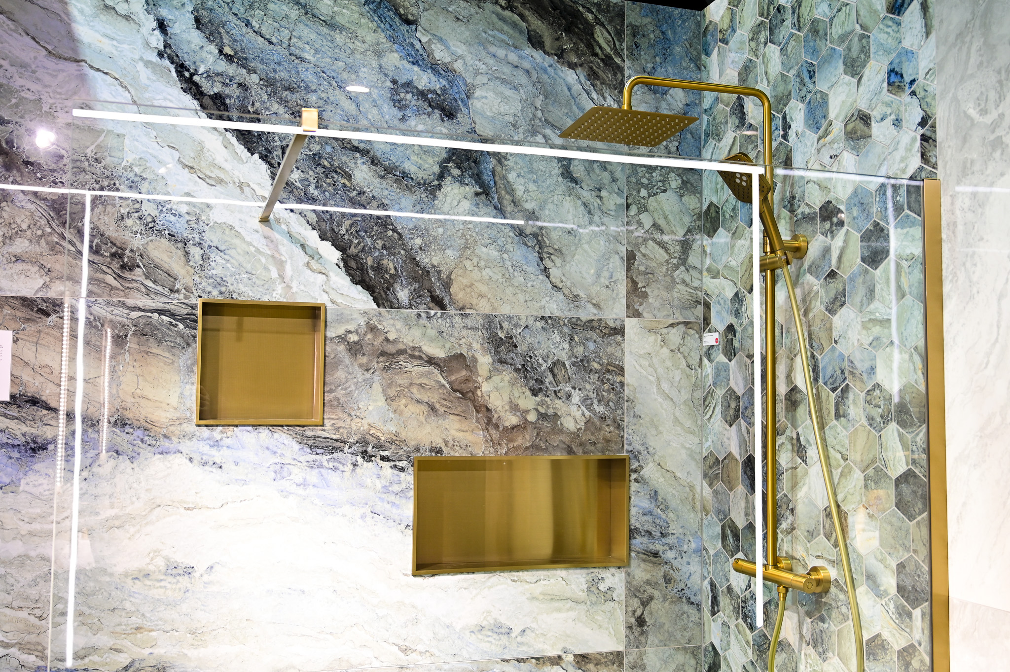 Laat je verleiden door de tijdloze schoonheid van de marmer blauwe hexagon muurtegels en de strakke rechthoekige muurtegels, die samen een luxueuze sfeer creëren die je badkamer naar een hoger niveau tilt. Of je nu op zoek bent naar inspiratie voor een renovatieproject of gewoon wilt genieten van een moment van luxe, onze Box A Mystic Sant’ Agostino showroom biedt alles wat je nodig hebt om je badkamerdromen werkelijkheid te laten worden. Kom langs en laat je verrassen door de mogelijkheden!