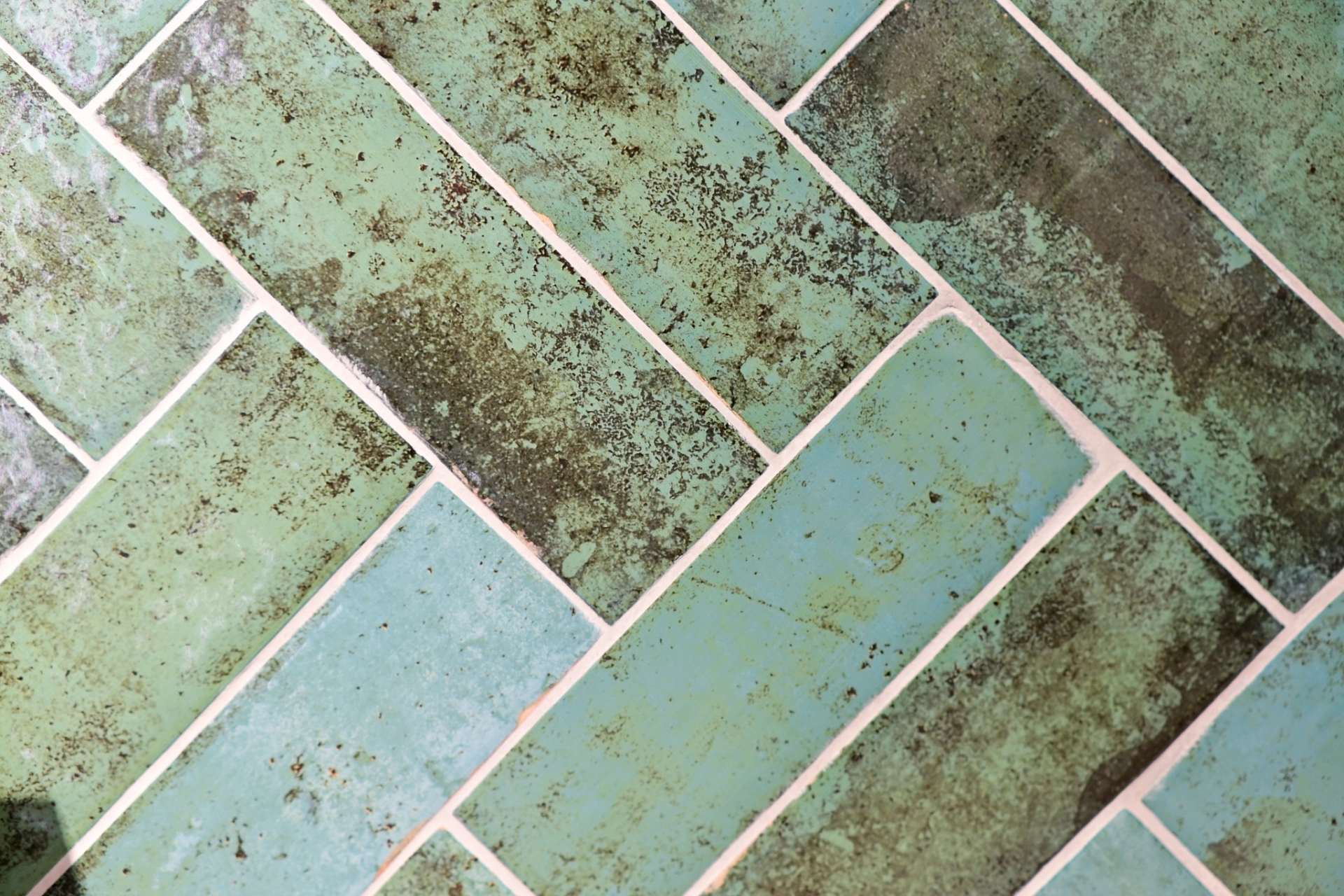 Stap binnen in de Box D Tennesse APE showroom, waar contrasten samenkomen om een unieke esthetiek te creëren. De zwarte meubels en accessoires, waaronder de wastafel, rek, kastje en spiegelrand, contrasteren prachtig met de groene rustieke porseleinen steenstrip mozaïektegels aan de ene kant en de beige tegels aan de andere kant.