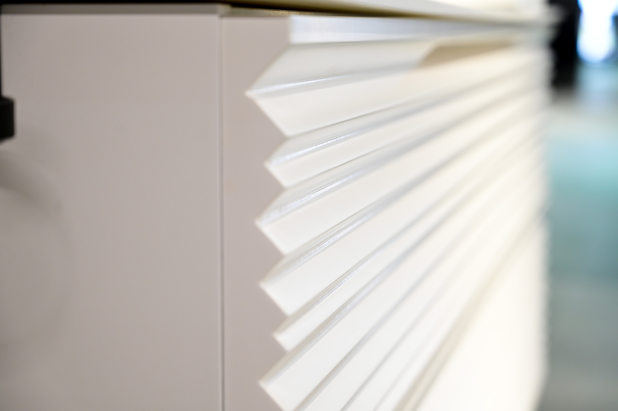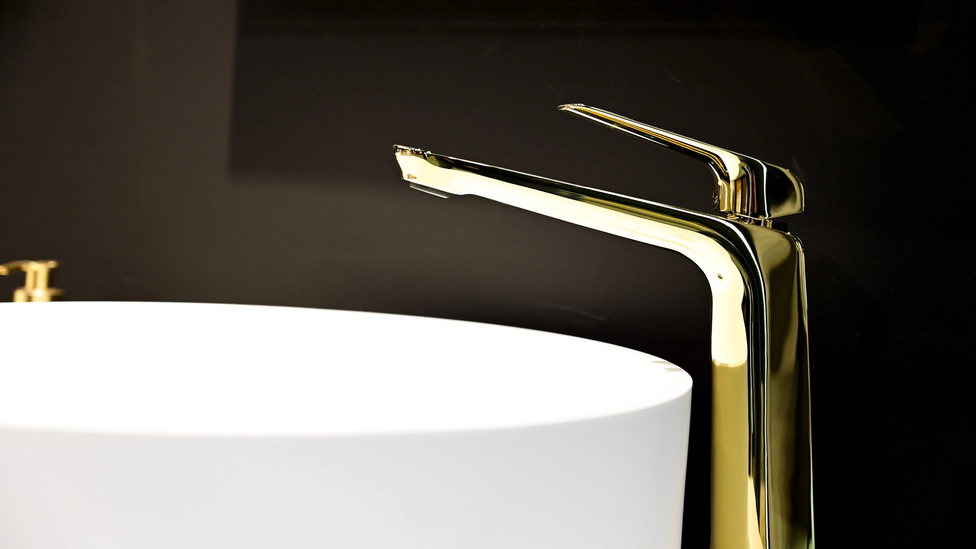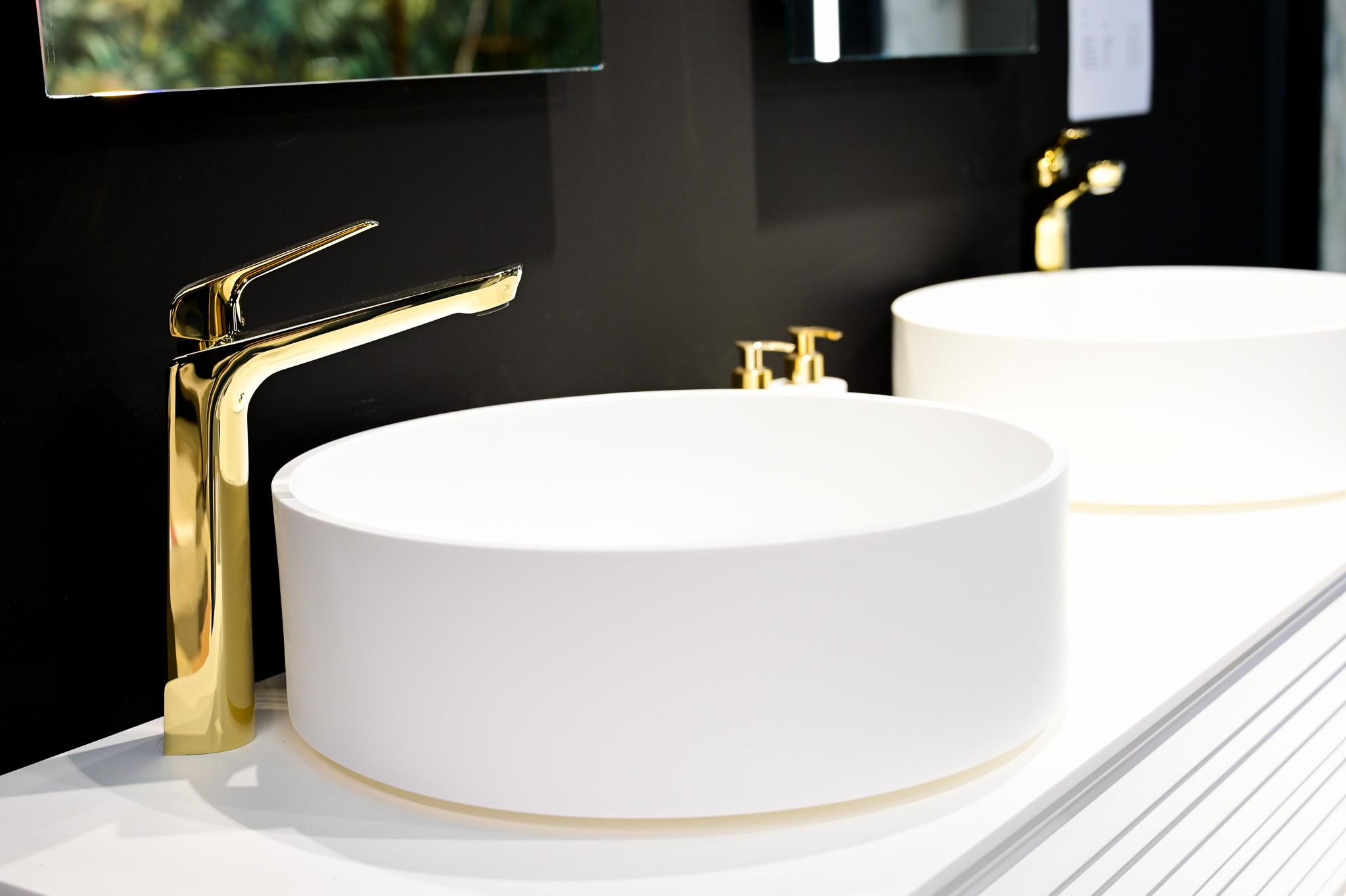 De zwarte wandtegels van Dune vormen een gedurfd contrast met de witte wastafel, waardoor deze echt naar voren komt als het stralende middelpunt van de ruimte. De gouden kranen voegen een vleugje luxe toe aan het geheel, terwijl degeribbelde structuur van de kastfronten een subtiele textuur en diepte toevoegt aan het moderne design.