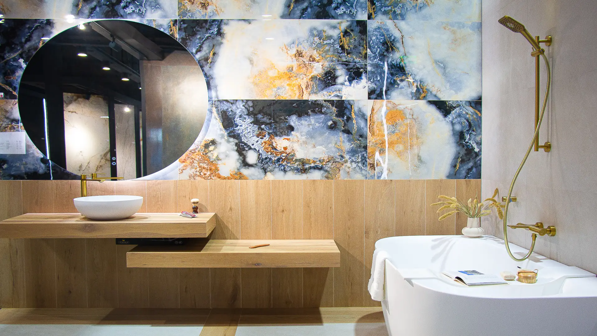 Laat je verleiden door de gouden accenten die elke hoek van deze badkamer verfraaien, van de glinsterende kraan tot de sprankelende douchekop. De houten details voegen een warme en uitnodigende sfeer toe, terwijl het bad en de grote ronde spiegel een gevoel van luxe en comfort bieden.