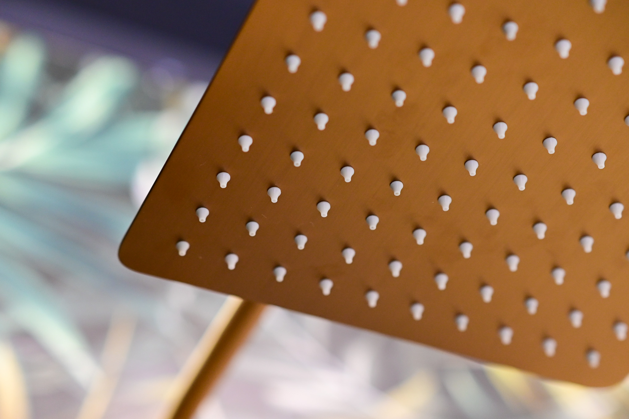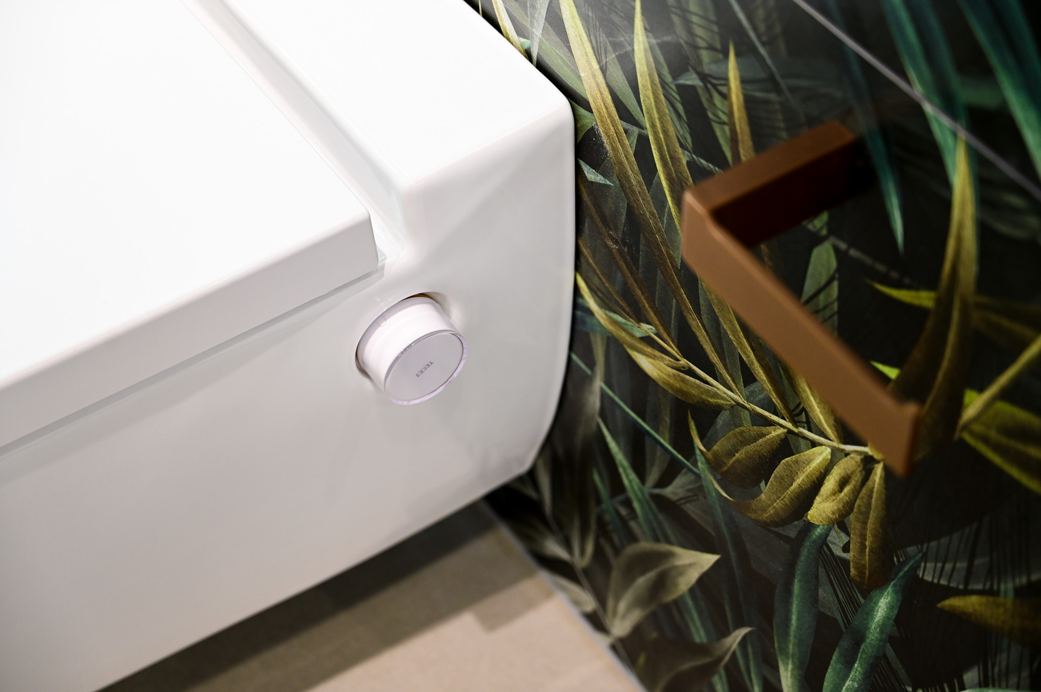 Ontdek de verfijnde details van onze badkamer setting in showroom Sable Sant'Agostino. De groene bladerenprint op de wandtegels brengt de natuur naar binnen en zorgt voor een rustgevende sfeer. De staande douche metregenkop en het wandtoilet bieden ultiem comfort en functionaliteit voor een ontspannen badkamerervaring.