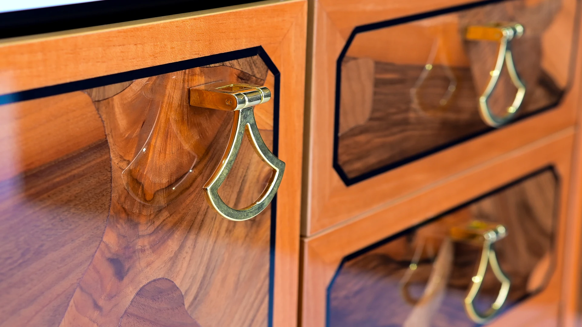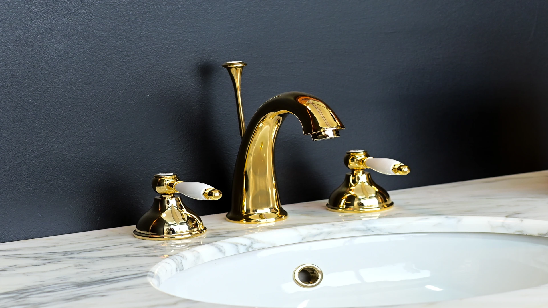 In deze luxueuze badkamer setting wordt een unieke vintage stijl gecreëerd die een nostalgisch gevoel oproept. De twee gootstenen, met witte afwasbakken en gouden accenten zoals de kraan en kastgrepen, stralen een tijdloze elegantie uit die de ruimte een verfijnde uitstraling geeft. De spiegel, perfect in lijn met de kast, voegt een vleugje klasse toe aan de setting.